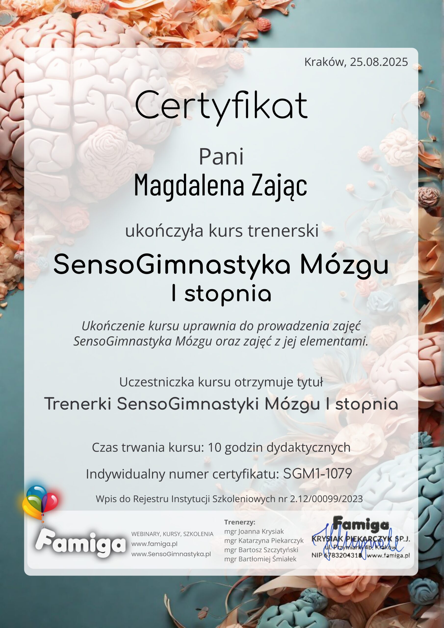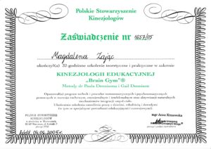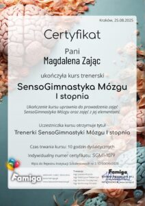 Patrzę na rozwój dziecka w sposób holistyczny – uwzględniając ciało, emocje i umysł. Uważam, że klucz do sukcesu tkwi w połączeniu ruchu, uważności oraz świadomego wspierania funkcji poznawczych.